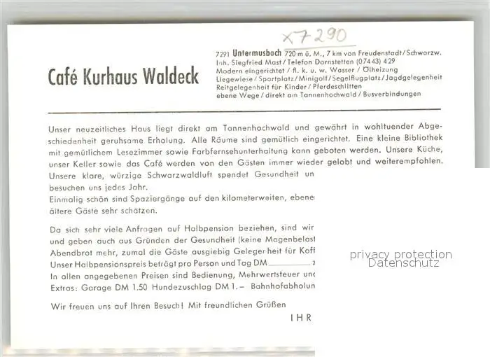 Untermusbach_Freudenstadt Cafe Kurhaus Waldeck Untermusbach_Freudenstadt postalisch nicht gelaufen 1921-1965 Werbekarte (keine Postkarte) Erhaltung siehe scans [KathaD81] Werbekarte (keine Postkarte) Kathoren