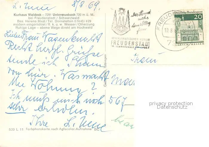 Untermusbach_Freudenstadt Kurhaus Waldeck im Schwarzwald Untermusbach_Freudenstadt postalisch gelaufen 1969 Erhaltung siehe scans [FriedD77] Frierer