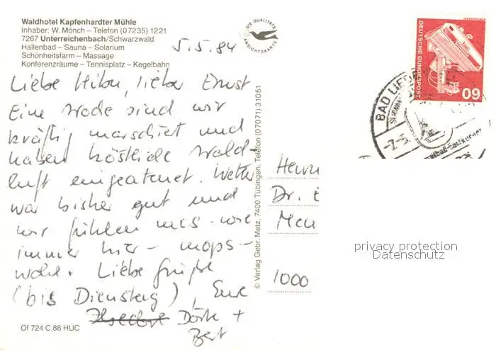 Unterreichenbach_Calw Waldhotel Kapfenhardter Muehle Unterreichenbach Calw postalisch gelaufen 1984 Erhaltung siehe scans [LiesaD40] LiesID40