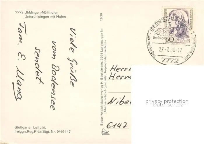 Unteruhldingen_Bodensee Fliegeraufnahme Gesamt mit Hafen postalisch gelaufen 1988 Erhaltung siehe scans [LiesaD40] LiesID40