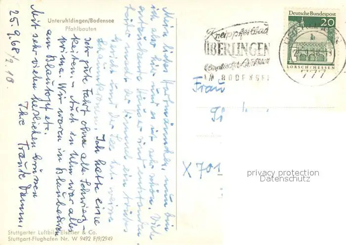 Unteruhldingen_Bodensee mit Pfahlbauten Fliegeraufnahme postalisch gelaufen 1968 Erhaltung siehe scans [WerneD78] WernPID7
