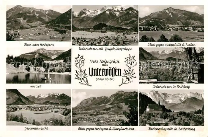 Unterwoessen Panorama Blick zum Hochgern Geigelsteingruppe Hochplatte Raiten See Fruehling Marquartstein Kapelle Alpenpanorama Unterwoessen postalisch gelaufen 1921-1965 Erhaltung siehe scans [FriedD77] Frierer
