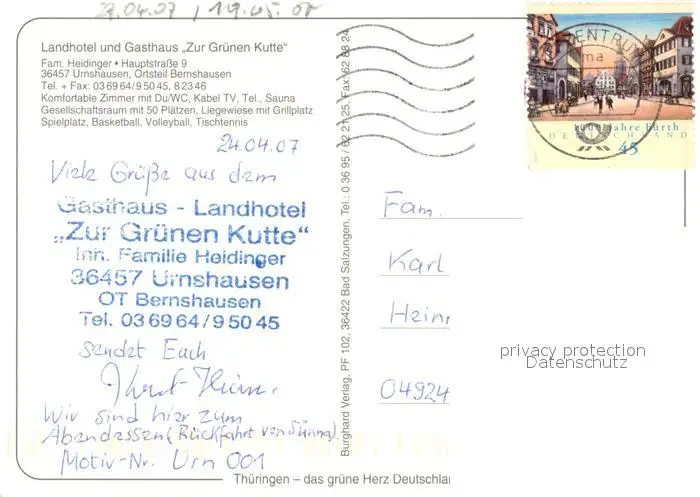 Urnshausen Landhotel zur gr?nen Kutte Urnshausen postalisch gelaufen 1907 Erhaltung siehe scans [LiesaD40] LiesID40