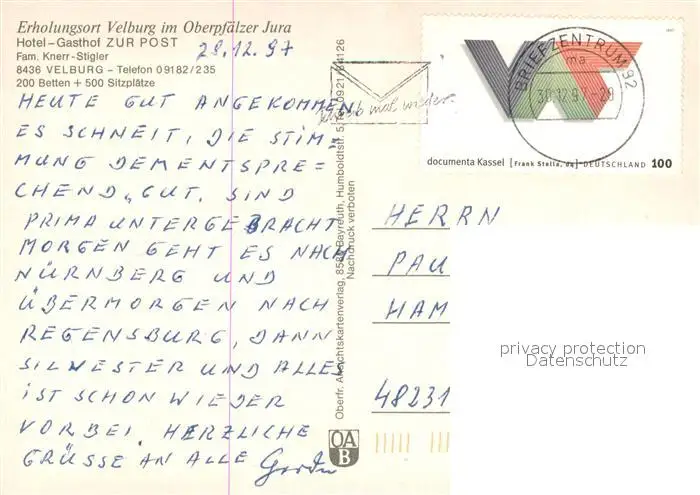 Velburg Hotel Gasthof zur Post Restaurant Velburg postalisch gelaufen 1997 Erhaltung siehe scans [FriedD77] Frierer