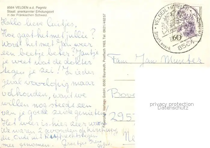 Velden_Mittelfranken Ortsmotiv mit Kirche Torturm Uferpartie an der Pegnitz Velden Mittelfranken postalisch gelaufen nach 1965 Erhaltung siehe scans [FriedD77] Frierer