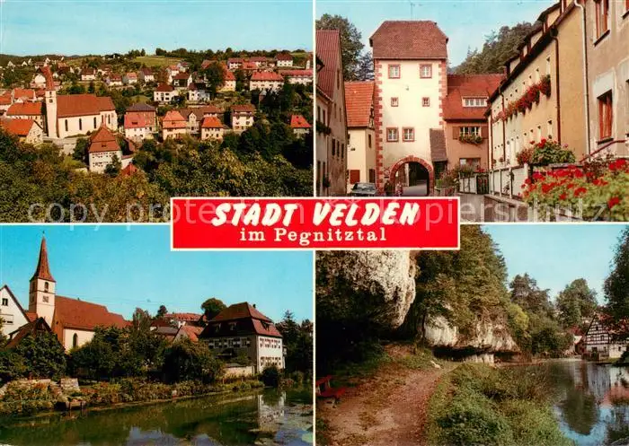 AK / Ansichtskarte Velden_Mittelfranken Stadtpanorama Stadttor Altstadt Kirche Uferpartie an der Pegnitz Velden Mittelfranken