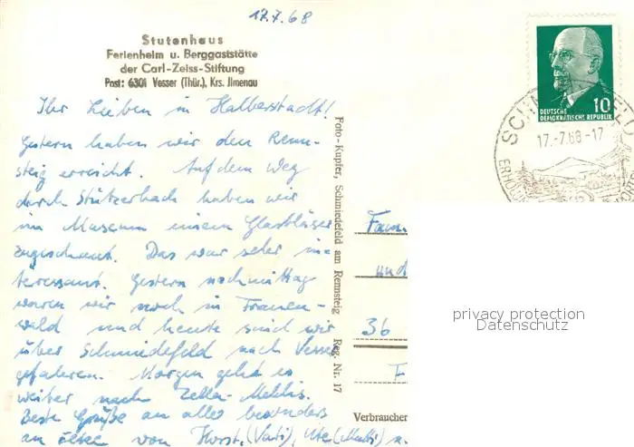 Vesser_Rennsteig Stutenhaus Ferienheim Berggaststaette der Carl Zeiss Stiftung Vesser_Rennsteig postalisch gelaufen 1968 Erhaltung siehe scans [FriedD77] Frierer