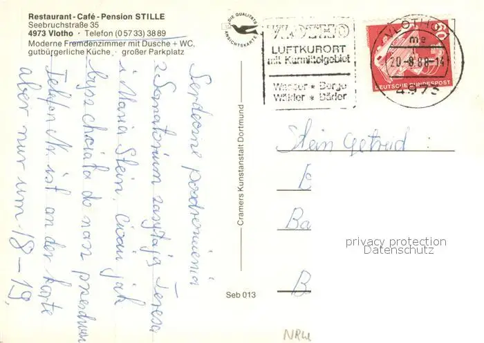Vlotho Restaurant Cafe Pension Stille Vlotho postalisch gelaufen 1988 Erhaltung siehe scans [WerneD78] WernPID7