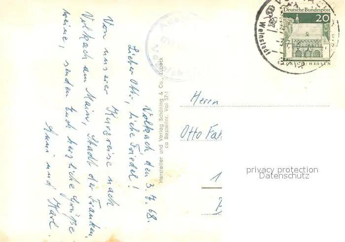 Vogelsburg_Volkach Rathaus Brunnen Kirche Stadttor Saeule Mainpartie Vogelsburg Volkach postalisch gelaufen 1968 Erhaltung siehe scans [WerneD78] WernPID7