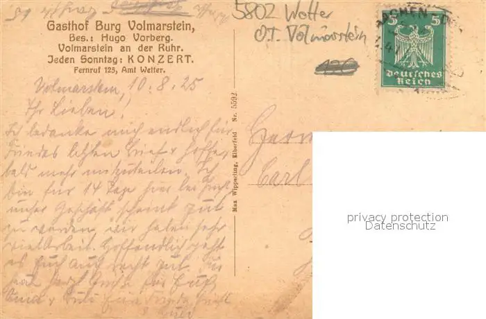 Volmarstein Gasthof Burg Volmarstein postalisch gelaufen 1925 Erhaltung siehe scans [LiesaD40] LiesID40
