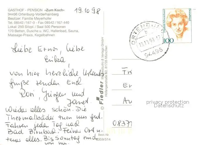 Vorderhainberg Gasthof Pension Zum Koch Kegelbahn Hallenbad Vorderhainberg postalisch gelaufen 1998 Erhaltung siehe scans [FriedD77] Frierer