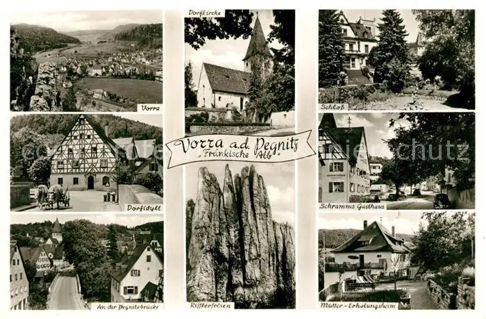 Vorra_Pegnitz Kirche Schloss Dorfidyll Schramms Gasthaus Pegnitzbruecke Rifflerfelsen Muetter Erholungsheim Vorra Pegnitz postalisch nicht gelaufen nach 1965 Erhaltung siehe scans [WerneD78] WernPID7