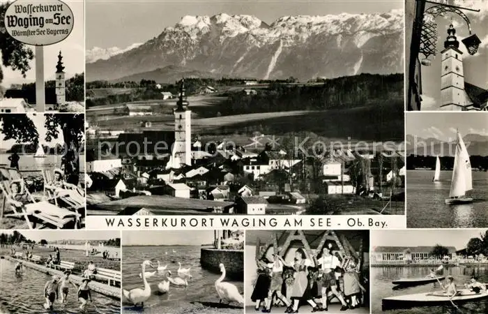 Waging_See Kneippbecken Kirchturm Segelboote Volkstanzgruppe Kanu Waging_See postalisch nicht gelaufen 1921-1965 Erhaltung siehe scans [KathaD81] Kathoren