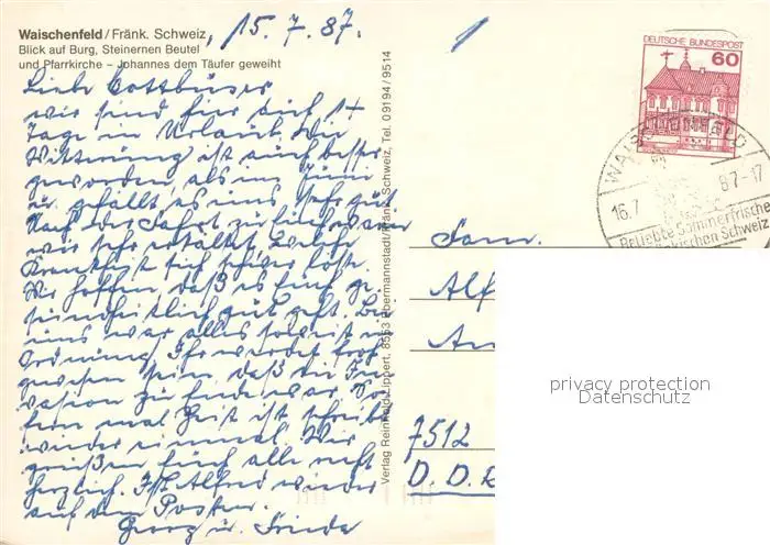 Waischenfeld Burgblick Steinerner Beutel Pfarrkirche Waischenfeld postalisch gelaufen 1987 Erhaltung siehe scans [FriedD77] Frierer