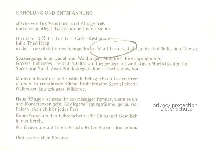 Walbeck_Rheinland Haus Roettgen im Freizeitzentrum Restaurant Kegelbahn Freibad Walbeck_Rheinland postalisch nicht gelaufen nach 1965 Werbekarte (keine Postkarte) Erhaltung siehe scans [FriedD77] Werbekarte (keine Postkarte) Frierer