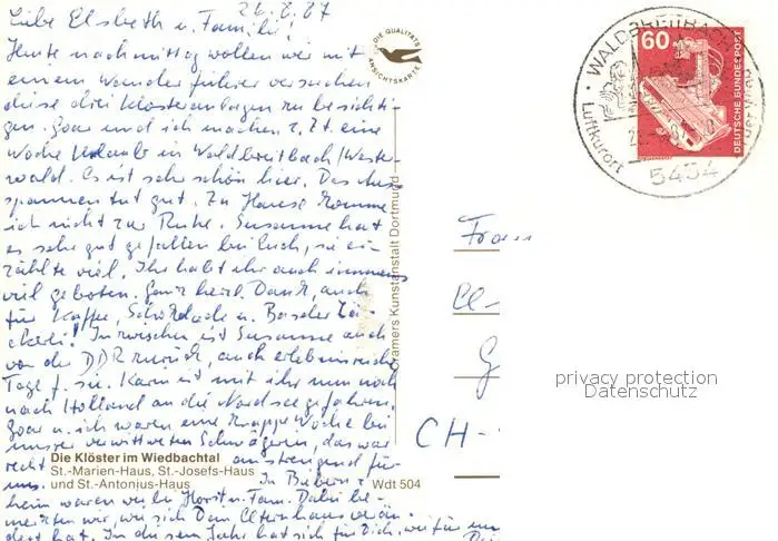 Waldbreitbach_Wied Kloester im Wiedbachtal Waldbreitbach Wied postalisch gelaufen 1987 Erhaltung siehe scans [LiesaD40] LiesID40