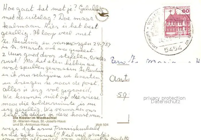 Waldbreitbach_Wied Kloester im Wiedbachtal Waldbreitbach Wied postalisch gelaufen 1987 Erhaltung siehe scans [LiesaD40] LiesID40