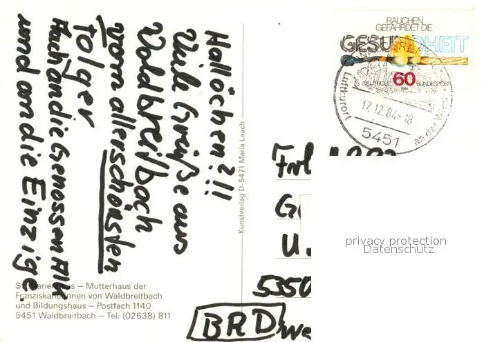Waldbreitbach_Wied St Marienhaus Mutterhaus der Franziskanerinnen Waldbreitbach Wied postalisch gelaufen 1984 Erhaltung siehe scans [WerneD78] WernPID7