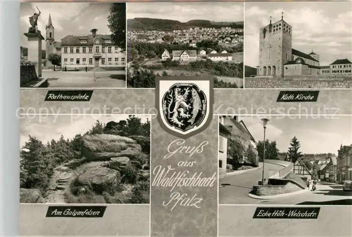 AK / Ansichtskarte Waldfischbach Burgalben Rathausplatz Kirche Galgenfelsen Ecke Hoeh Welschstrasse Stadtpanorama Wappen Bromsilber Waldfischbach Burgalben