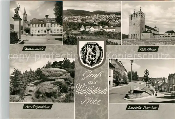 Waldfischbach-Burgalben Rathausplatz Kirche Galgenfelsen Ecke Hoeh Welschstrasse Wappen Bromsilber Waldfischbach-Burgalben postalisch nicht gelaufen nach 1965 Erhaltung siehe scans [FriedD77] Frierer