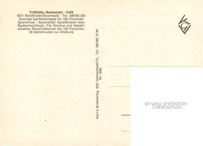Waldfriede_Bad_Sobernheim Kategorie Alte Ansichtskarten Postkarten bx62703 Waldfriede_Bad_Sobernheim Fliegeraufnahme Trifthuette Restaurant Cafe Waldfriede_Bad_Sobernheim postalisch nicht gelaufen Erhaltung siehe scans [KathaD81]