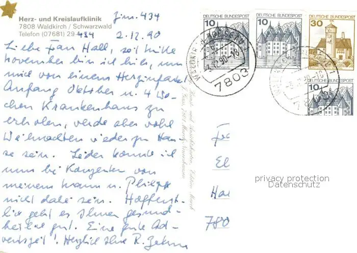 Waldkirch_Breisgau Herz Kreislauf Klinik Schwarzwald Waldkirch Breisgau postalisch gelaufen 1990 Erhaltung siehe scans [FriedD77] Frierer