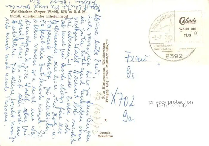 Waldkirchen Niederbayern Kategorie Alte Ansichtskarten Postkarten bx92967 Waldkirchen_Niederbayern Fliegeraufnahme Waldkirchen Niederbayern postalisch gelaufen 1972 Erhaltung siehe scans [WerneD78]