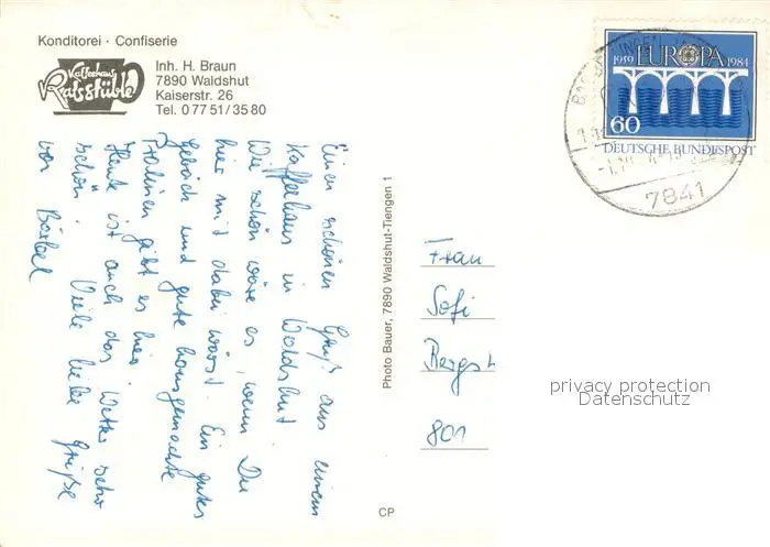 Waldshut-Tiengen Konditorei Kaffeehaus Ratsstueble Waldshut-Tiengen postalisch gelaufen nach 1965 Erhaltung siehe scans [WerneD78] WernPID7
