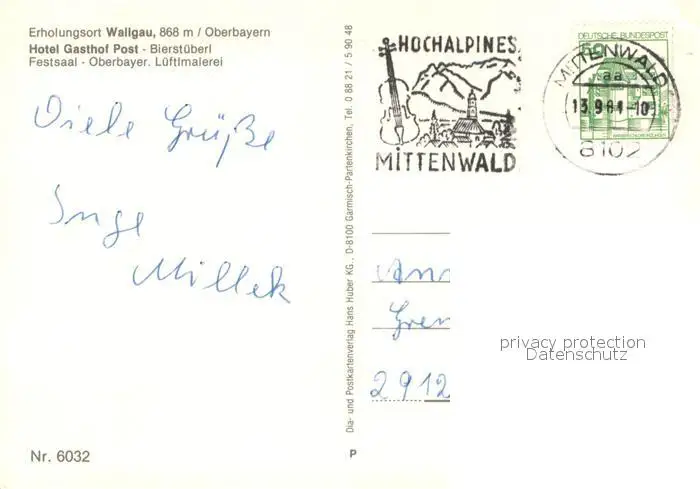Wallgau Gasthof Post Restaurant Festsaal Oberbayerische Lueftlmalerei Wallgau postalisch gelaufen 1981 Erhaltung siehe scans [FriedD77] Frierer
