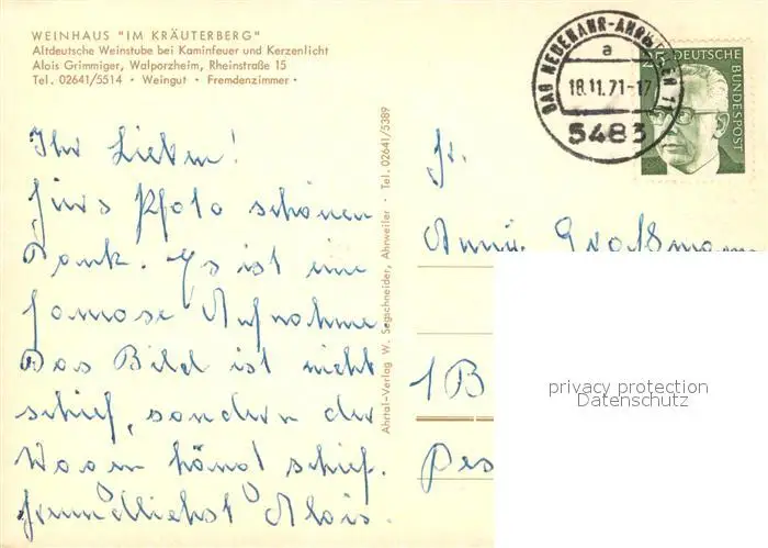Walporzheim Weinhaus Im Kraeuterberg Altdeutsche Weinstube Kamin Walporzheim postalisch gelaufen 1971 Erhaltung siehe scans [FriedD77] Frierer