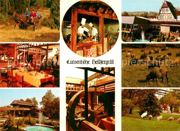 AK / Ansichtskarte Walsrode_Lueneburger_Heide Luisenhoehe Heidjergrill Forellenlokal Gaststube Brunnen Rinderherde Pferdekutsche Muehlrad Walsrode_Lueneburger_Heide