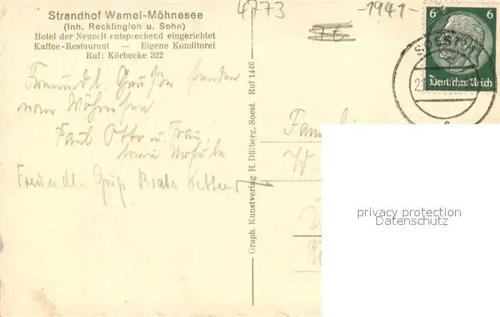 Wamel_Moehnesee Strandhof am Strandbad Wamel-Moehnesee Wamel Moehnesee postalisch gelaufen 1941 Erhaltung siehe scans [LiesaD40] LiesID40