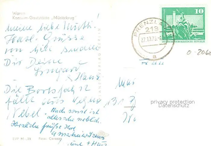 Waren_Mueritz Konsum Gaststaette Mueritzkrug an der Mueritz Mecklenburgische Seenplatte Waren Mueritz postalisch gelaufen 1975 Erhaltung siehe scans [FriedD77] Frierer