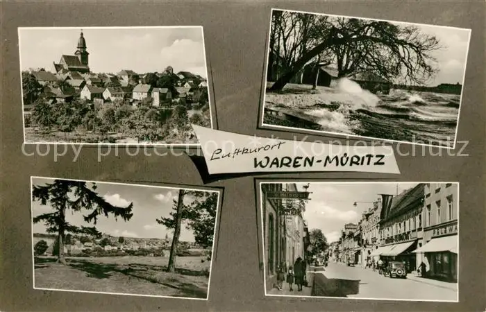 AK / Ansichtskarte Waren_Mueritz Ortsansicht mit Kirche Landschaftspanorama Uferpartie an der Mueritz Mecklenburgische Seenplatte Handabzug Waren Mueritz