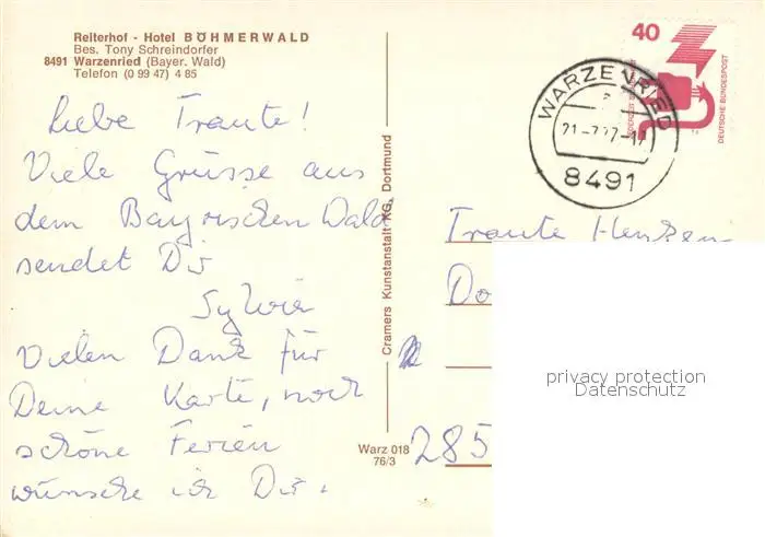 Warzenried Kategorie Alte Ansichtskarten Postkarten bx92968 Warzenried Reiterhof Hotel Boehmerwald Fliegeraufnahmen Warzenried postalisch gelaufen 1977 Erhaltung siehe scans [WerneD78]
