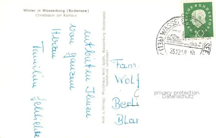 Wasserburg_Bodensee Christbaum am Rathaus Weihnachtskarte Neujahrskarte Wasserburg Bodensee postalisch gelaufen 1959 Erhaltung siehe scans [FriedD77] Frierer