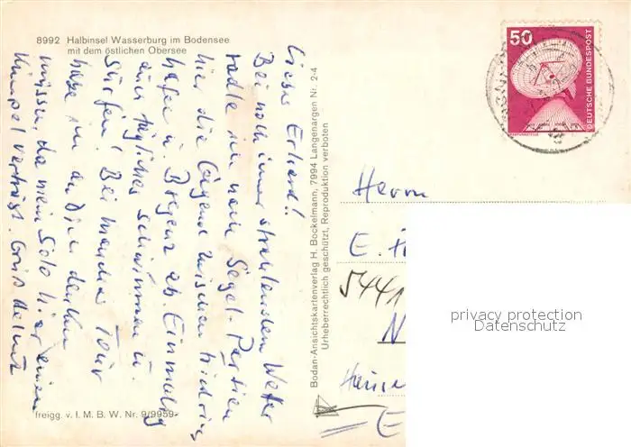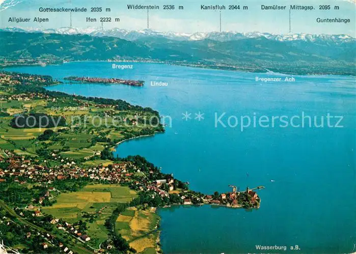 Wasserburg_Bodensee Halbinsel Obersee Alpenkette Fliegeraufnahme Wasserburg Bodensee postalisch gelaufen 1982 Erhaltung siehe scans [FriedD77] Frierer