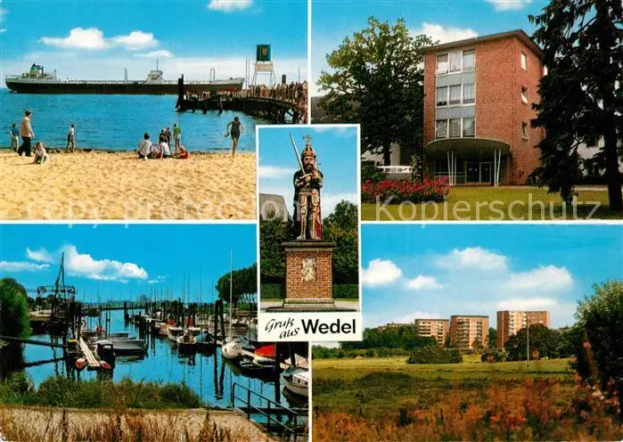 AK / Ansichtskarte Wedel_Pinneberg Wohnsiedlung Hochhaeuser Roland Statue Schulauer Faehrhaus Willkommhoeft Hafen Hochseeschiff Wedel Pinneberg
