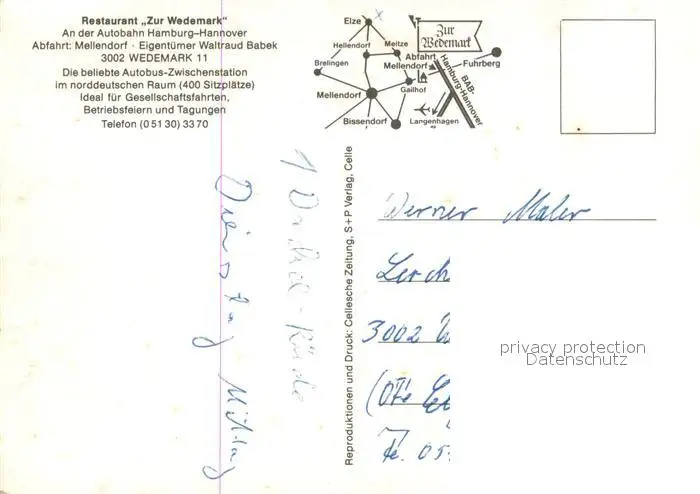 Wedemark Restaurant Zur Wedemark Kueche Wedemark postalisch nicht gelaufen nach 1965 Erhaltung siehe scans [FriedD77] Frierer