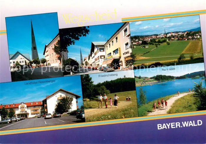 AK / Ansichtskarte Wegscheid_Niederbayern Ortszentrum mit Kirche Landhotel Rosenberger Friedrichsberg Rannasee Panorama Bayerischer Wald Wegscheid Niederbayern