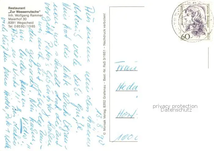 Wegscheid_Niederbayern Restaurant Zur Wasserrutsche am Rannasee Wegscheid Niederbayern postalisch gelaufen 1990 Erhaltung siehe scans [FriedD77] Frierer