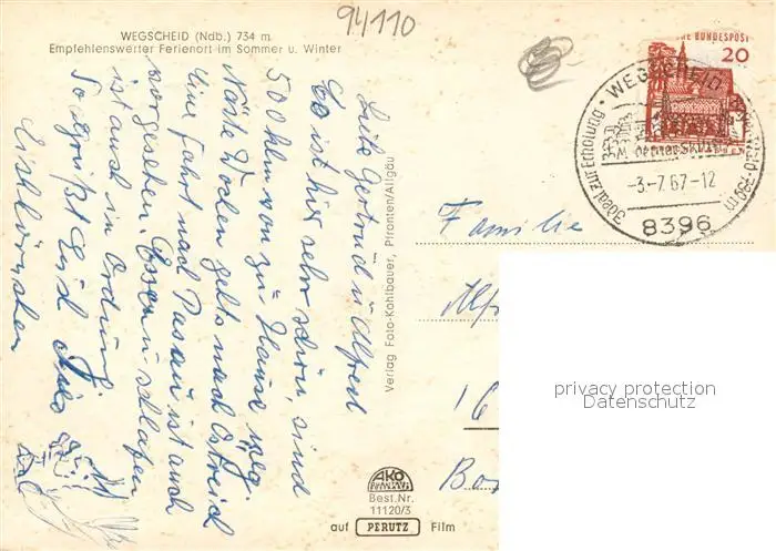 Wegscheid Niederbayern Kategorie Alte Ansichtskarten Postkarten bx55712 Wegscheid_Niederbayern Wegscheid Niederbayern postalisch gelaufen 1967 Erhaltung siehe scans [NatalD47]