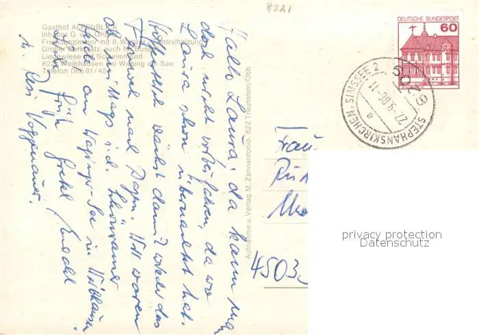 Weibhausen Gasthof Pension Gruber Fremdenzimmer Weibhausen postalisch gelaufen 1986 Erhaltung siehe scans [FriedD77] Frierer