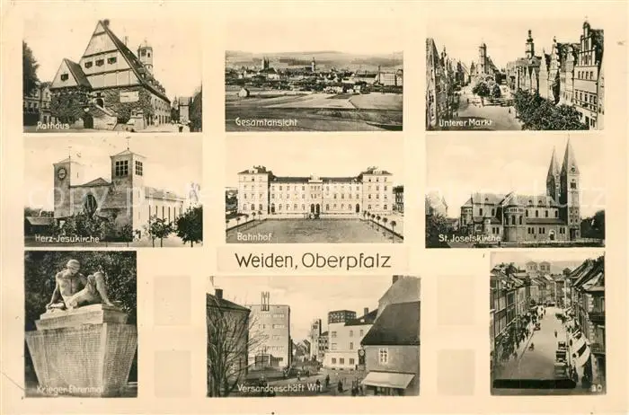 AK / Ansichtskarte Weiden_Oberpfalz Rathaus Panorama Unterer Markt Herz Jesu Kirche Bahnhof St Josefskirche Krieger Ehrenmal Versandhaus Witt Weiden Oberpfalz