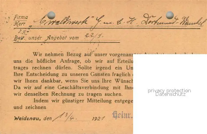 Weidenau_Sieg Heinrich Schumann Blechwaren Fabrik Geschaeftskorrespondenz Weidenau Sieg postalisch gelaufen 1921 Erhaltung siehe scans [FriedD77] Frierer