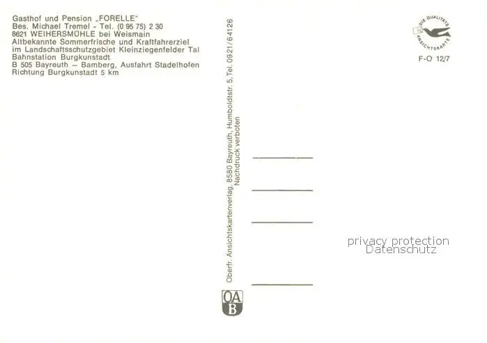Weihersmuehle_Weismain Gasthof Pension Forelle Panorama Kleinziegenfelder Tal Weihersmuehle_Weismain postalisch nicht gelaufen nach 1965 Erhaltung siehe scans [FriedD77] Frierer