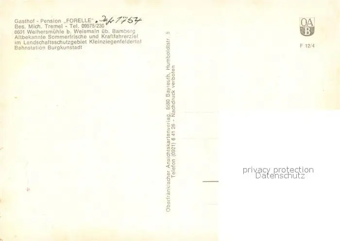 Weihersmuehle_Weismain Gasthof Pension Forelle Panorama Kleinziegenfelder Tal Weihersmuehle_Weismain postalisch nicht gelaufen nach 1965 Erhaltung siehe scans [FriedD77] Frierer
