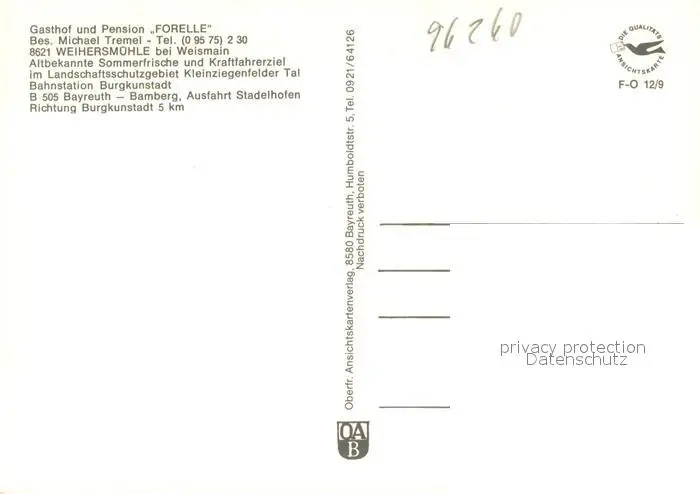 Weihersmuehle_Weismain Gasthof Pension Forelle im Kleinziegenfelder Tal Weihersmuehle_Weismain postalisch nicht gelaufen nach 1965 Erhaltung siehe scans [FriedD77] Frierer