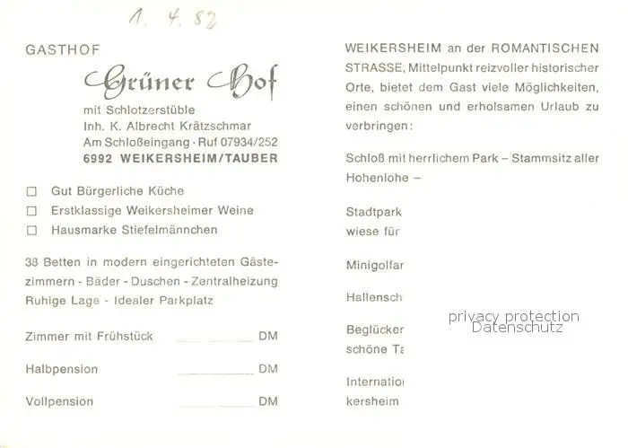 Weikersheim Gasthof Gruener Hof Schloss Park Brunnen Weikersheim postalisch nicht gelaufen 1982 Werbekarte (keine Postkarte) Erhaltung siehe scans [FriedD77] Werbekarte (keine Postkarte) Frierer