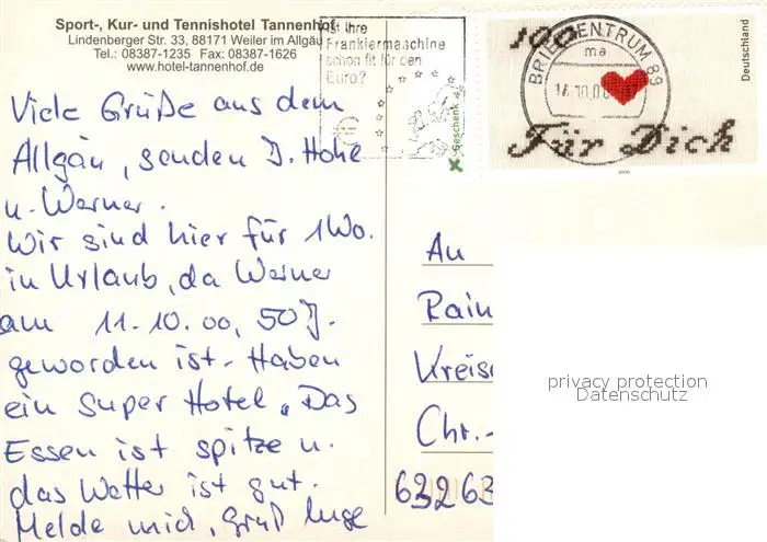 Weiler_Allgaeu Sport- und Kurhotel Tannenhof Tennisschule Hallenbad Weiler_Allgaeu postalisch gelaufen 2000 Erhaltung siehe scans [FriedD77] Frierer
